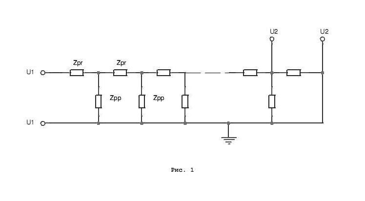 Она состоит из n числа продольно включенных элементов Zpr. Продольные элементы делителя Zpr, обычно, резисторы или (и) конденсаторы, к которым приложено высокое напряжение U1. В схеме учтены и паразитные параметры продольных элементов. В схеме равномерно распределены поперечные сопротивления Zpp, учитывающие, например, распределенную емкость делителя на землю и другие элементы конкретной конструкции делителя.